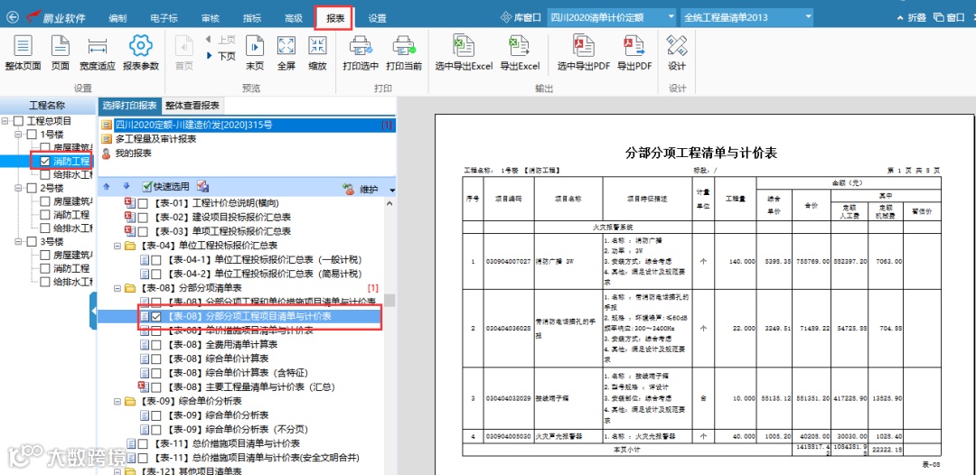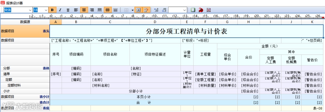 进入到“报表设计”界面,如对“【表-08】分部分项工程和单价措施项目清单与计价表”进行自定义设计: