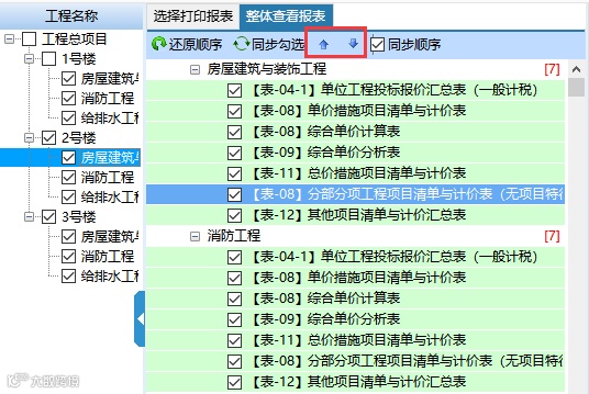 在整体查看表里可以对勾选的表格进行查看,也可以对勾选表格的顺序进行调整。点击上下移动按钮即可调整表格的顺序。