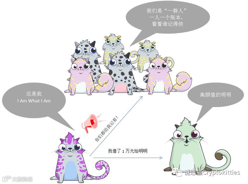 经高人指点,我找来了一群人来帮我见证,他们各人手头都有一本账本。我用大喇叭告诉他们,我借了1万元给明明,于是他们都在账本上做好了记录。这回明明无法赖账了! 村里高人说这就是“区块链的去中心化机制”,安全、可靠、有保障。大家手里的账本,就是区块。所有的账本连起来,就是区块链。