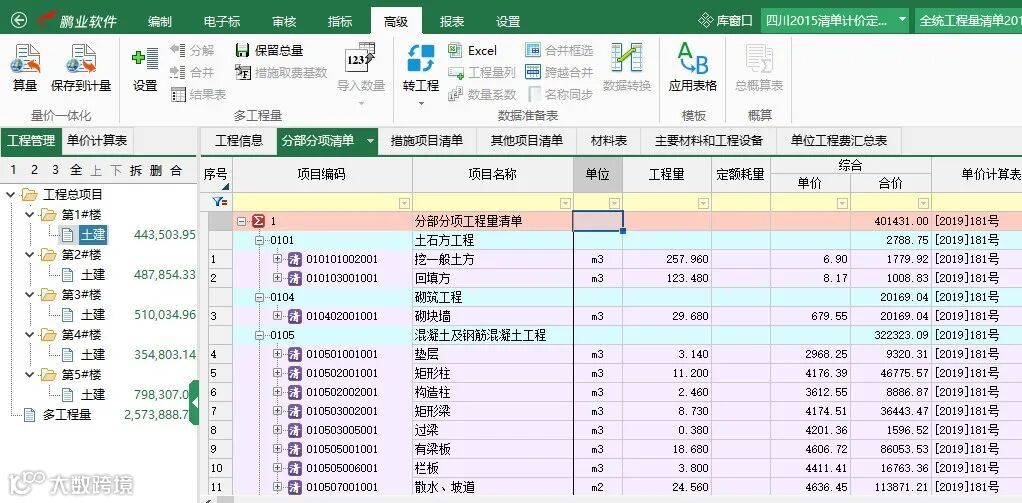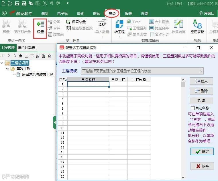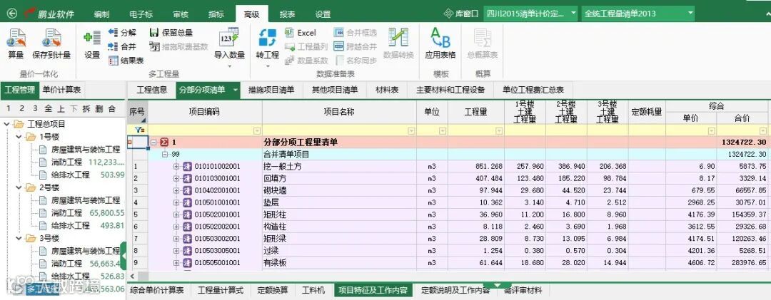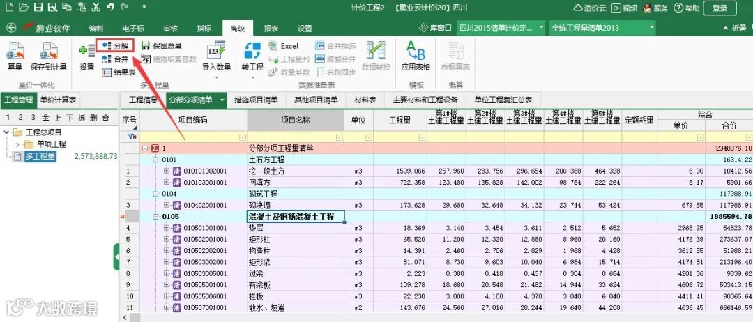 3、多工程量工程设置好后可以在同一个清单(预算)表中同时完成多个单位工程工程量的输入以及组价。点击高级-分解按钮,可以将输入的工程量数据分解到各单位工程。