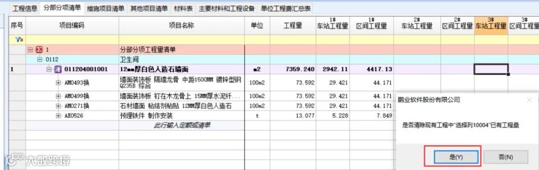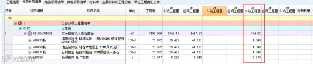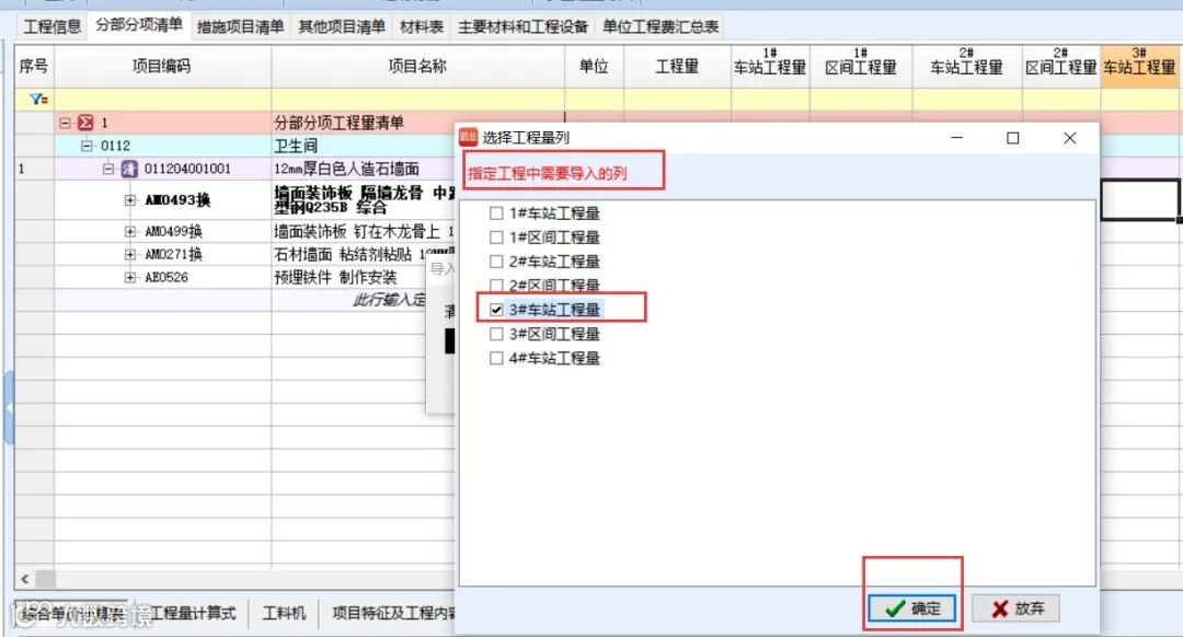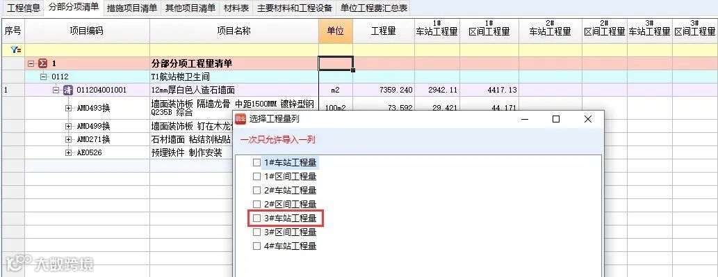 (1)点击“导入工程量”,选择需要导入工程量列的3#车站工程量。如图示: