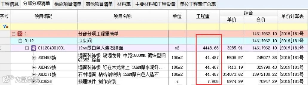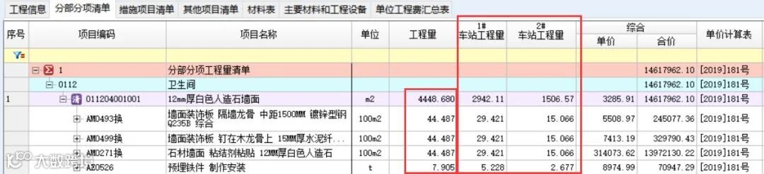 (4)点击确定后,已有数据工程量导入到当前工程中,实现多人编制数据进行合并。如图示: