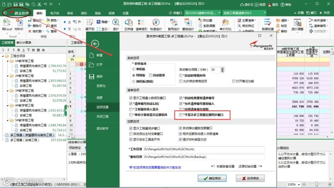 2、列与列 (单位工程与单位工程) 之间定额工程量不同步窗口设置:点击设置-参数-编辑设置进行设置取消不显示定额同步对话框。如图示: