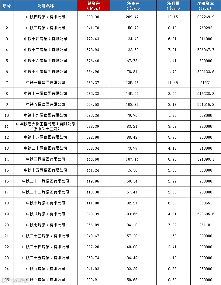 从总资产规模来看,中铁1局至25局,总资产规模超过600亿元的工程局有8家。中铁四局以993.30亿元的总资产排在25个工程局中首位,中铁二局总资产941.70亿元排在第二位。