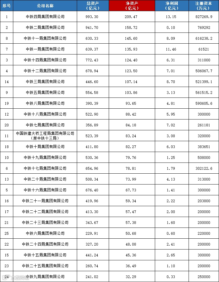 两大公司报告中相继公布了各子公司情况,作为两大建筑央企下面的25个二级号码子公司,中铁1到25局,也都实力非常强劲,我们摘取2022上半年中铁1到25局数据,分别从总资产、净资产、净利润三个方面进行对比,到底哪个实力更胜一筹?