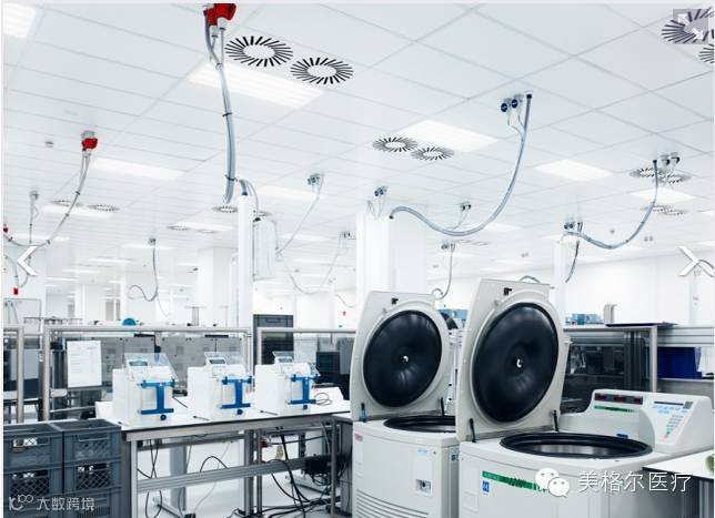 成排的蓝色实验服挂在架子上,使得“灰色区域”看起来更像是蓝色。由于这一区域位于白色无菌的血液工厂与外部的污染区域(又称黑色区域)之间,并起着净化作用,人们也称之为“灰色区域”。