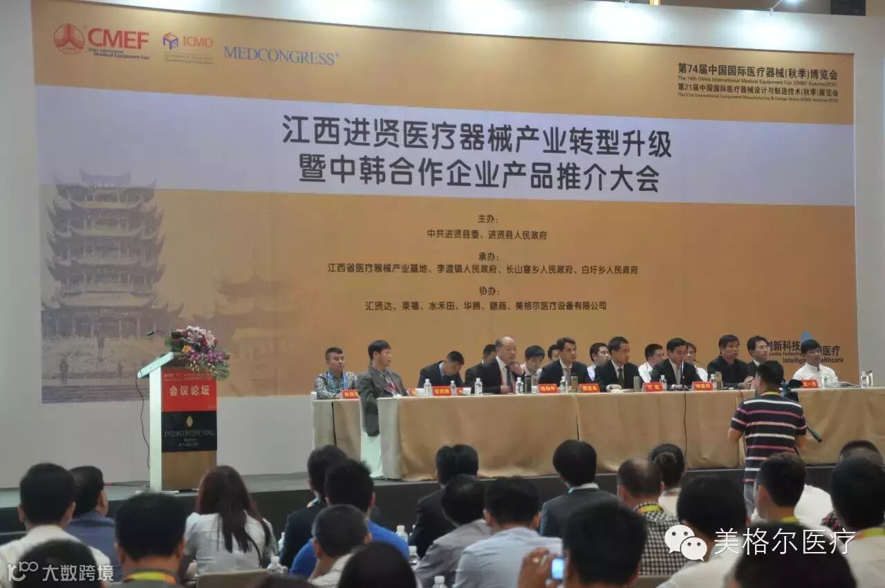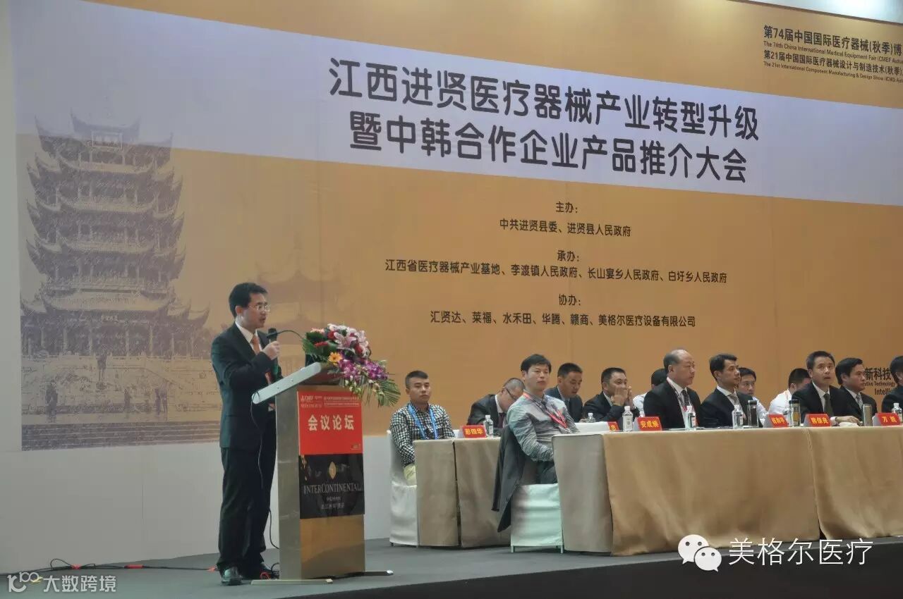 10月18日上午10点,由中共进贤县委、进贤县人民政府主办,江西省医疗器械产业基地、李渡镇人民政府、长山晏乡人民政府、白圩乡人民政府承办,汇贤达、莱福、水禾田、美格尔医疗设备有限公司协办的江西进贤医疗器械产业转型升级暨中韩合作企业产品推介大会在美丽的江城武汉隆重召开。