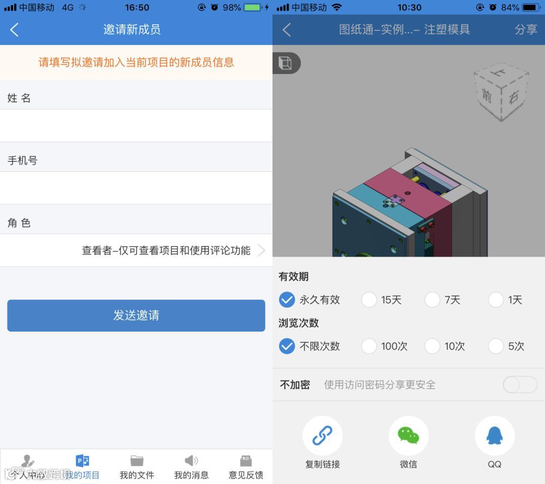图纸通提供【公开分享】和【加密分享】两种分享方式,加密分享还能设置有效期,真正确保图纸的安全性,并支持微信、QQ等社交工具,向同事及好友手机分享图纸和模型。