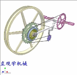 解析:按下粉红色踏板,通过锥齿轮传动和超越离合器使橙色轮旋转。由于车轮惯性,可以连续旋转。粉红色配重趋向于将踏板带到其上部位置(可以用弹簧代替)。