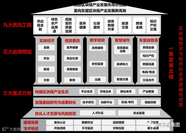 围绕上述建设目标,广西提出要以区块链技术与经济社会深度融合应用为一条发展主线,以赋能实体经济、推进信息惠民、增强数字政府、提质智慧城市、支撑中国-东盟信息港为5大应用领域,以构建区块链产业生态、加强基础研究与成果转化、优化人才支撑与风险防范为3大重点方向,打造南宁、桂林双核心,构建区块链产业特色发展轴和特色应用发展区,优先突破供应链金融、特色农产品溯源、民族医药质量追溯、医养健康、社保服务、政务数据共享、能源交易、跨境金融、知识产权交易等9大领域应用,囊括36个重点工程。