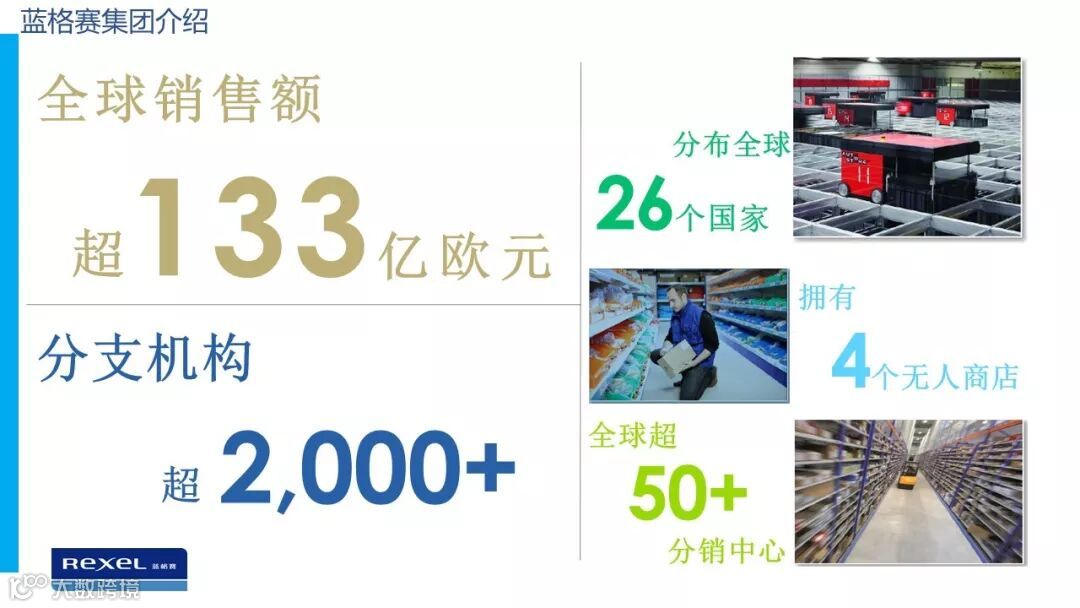 蓝格赛(Rexel)集团于1967年创立于法国,在全球27个国家中拥有销售网点超过2,000个,雇员25,000名。2018年,全球的销售额超过了133亿欧元,是全球最大的低压电器经销商。