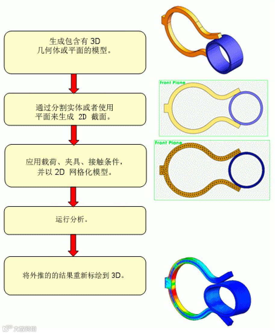 在SOLIDWORKS Simulation中做分析的时候,有时因为模型太过复杂,计算时间较长,对于此种情况,我们可以考虑使用2D简化;从而可供使用的平面应力、平面应变、拉伸及轴对称选项进行选择。在选取了2D简化选项后,求解问题的工作流程与所有选项类似。