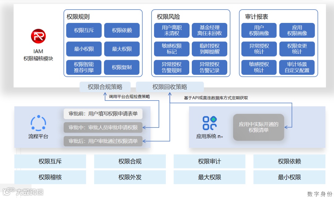 下游敏感资源快速回收,并对敏感资源识别、监控;识别授权阶段角色互斥、授权范围过宽、授权操作过大、过期权限、违反业务规则等风险;