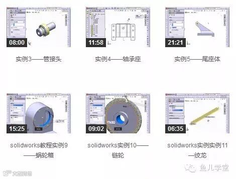 【solidworks视频教程实例】中共有36例,包含法兰盘、管接头、轴承座等常用零部件及离合器、汽车制动器、三爪卡盘等相对复杂的产品建模。