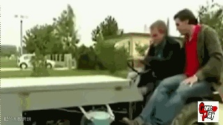 俩逗必自家草坪上玩拖拉机比赛,小的这位悲剧了