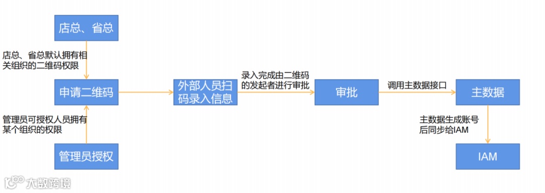 在身份管理场景创新上,针对过去加盟店非正式员工的身份账号与权限开通和管理也有了数字化新手段。店长通过二维码申请并由外部人员自行扫码录入信息,通过审批后,即可实现外部人员身份账号与权限统一管控。