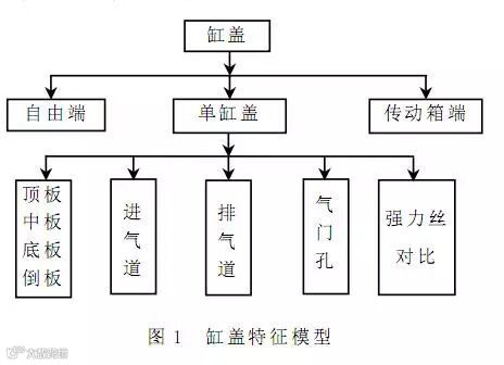 局部几何特征是处在特征层次图中最底层的特征,如进气道、排气道 、气门孔等 。整体零件特征是为尽可能提高今后修改设计的效率而设计的。将缸盖上采用的零件即自由端、单缸 盖 、传动箱端,通过其相关的局部几何特征预先建立模型,经参数化后存入缸盖标准特征库,它们实际上对应于缸盖特征层次途中第二层特征。