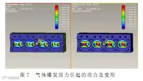 气体爆发压力引起的应力及变形, 如图 7 所示。由气体爆发压力引起的最大应力达到 71.8MPa,位于气门座及鼻梁区, 虽然该应力相对热应力比较小,但由于该应力为一高频应力, 应力变化频率比较快,容易造成高应力区域的疲劳破坏;同时,由于两缸压力存在极大的不均,因此局部应力特别大,对缸盖结构强度影响比较大。同时,爆发压力引起的最大形变位置位于鼻梁区,极高的温度和热应力加上压力的作用。所以,一般在与火焰接触的底板鼻梁区最容易出现裂纹。