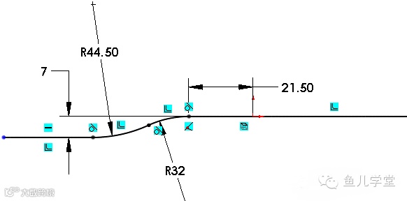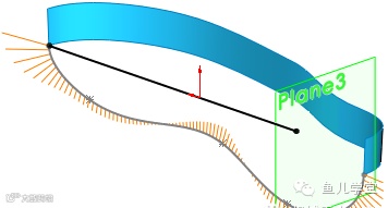 2) 在样条曲线与直纹曲面边线间添加相切约束,这样当我们放样曲面时就可以保证曲面 3° 的拔模角。