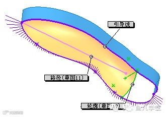 步骤 41 扫描曲面。选取轮廓、路径和引导线生成扫描曲面。