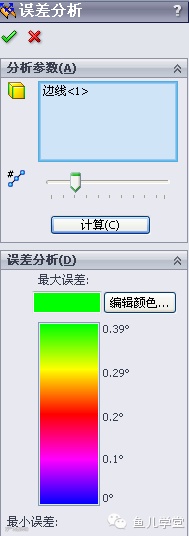 步骤 46 误差分析。选择下拉菜单的 【工具】/ 【误差分析】,或者单击 “工具 ” 工具栏中的【误差分析】 。选取填充曲面与扫描曲面相接处的边线。 单击 【计算】。