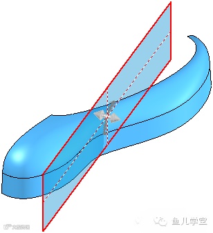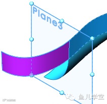 步骤 42 剪裁曲面。使用 “Plane3” 作为剪裁工具来剪裁带有 3° 拔模角的参考曲面。保留下来的曲面部分将作为填充曲面的参考曲面。