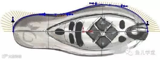 步骤 13 绘制上视方向分型线 (4 点样条曲线)样条曲线的两个端点与“Side View Sketch” 中参考直线的端点分别重合。两个端点处的样条曲线控标垂至于“Side View Sketch” 中的参考直线。显示样条曲线曲率梳,调整各型值点的位置基本与草图图片轮廓线重合,完毕后退出草图,命名为 “Top Parting Line”。