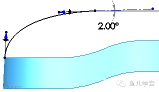 3) 通过样条曲线另一端绘制一条构造线,且与曲线相切,在构造线与步骤 17 所创建的等距面间标注一个角度尺寸,设定角度为 2.00°。