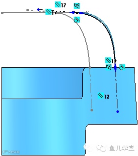 步骤 29 编辑新放样截面草图。观察草图约束,假如曲线端点与引导线以及直纹曲面边线间尚未建立 【穿透】约束,手工添加这些约束。绘制两条构造线分别相切于样条曲线,在本草图构造线与第二个轮廓草图中的构造线间分别添加【平行】约束。显示曲率梳并调整样条曲线形状直至满意为止。