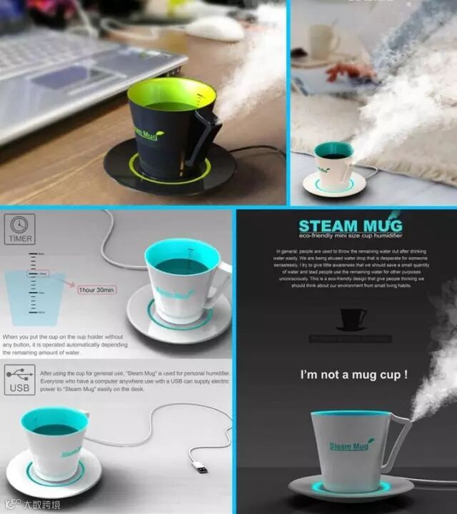 在杯子喝不完的水怎么办?倒掉么?设计师告诉你一个好的解决方式。把杯碟中的USB线插上,让水杯变身为一个加湿器。非常的适合这么炎热的夏天在空调房使用电脑的人使用哦。