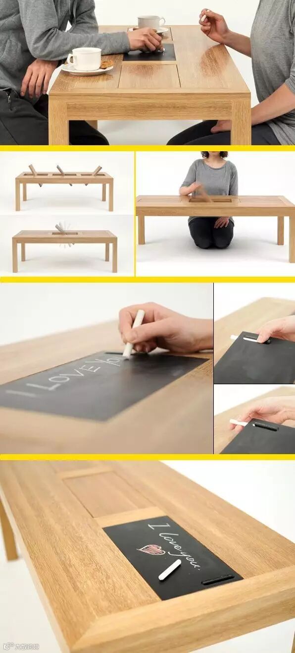这张桌面上可以写字的「涂鸦咖啡桌」让通常于桌子两侧所进行的对话增添了二度空间的互动感和乐趣。位于桌面上的三片木板翻面后即是黑板,还有放置粉笔的隐形凹槽。我觉得这项让一件简单物品的外型变得繁复的设计相当有意思,而且它绝对是个可以用来「破冰」的好话题!