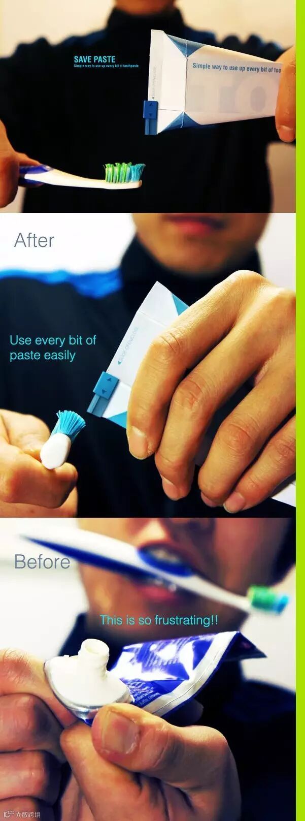 这是另一个有趣的牙膏包装设计,非常有意思 。三点创意:消除硬挤压死的空间,尽量减少容器内的底部牙膏残留,减少包装的使用 。这意味着我们可以减少浪费和制造的价格,再加上鼓励回收。一个环保低碳、清洁,简单,巧妙的友好设计,我们很乐意去使用它。对这些已经很熟悉的东西加入或者进行新的良好做法,又将是眼前一亮一个新好产品。生活中不缺乏创意,只要留心观察。