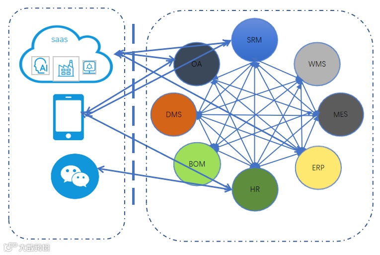 企业信息化早期,在以业务需求为导向过程中,企业逐步形成了多个紧耦合业务系统。为了实现业务数据流转,企业一般采用点对点的开发方式,形成了点对点的网状结构。