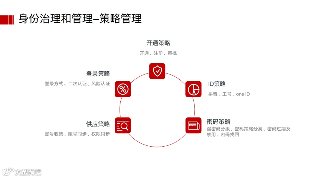 在身份管理系统中,主要是针对预设好的策略,对系统中的所有操作进行管理,主要包括:账号的开通、用户信息和身份的映射、密码管理及用户访问控制等。
