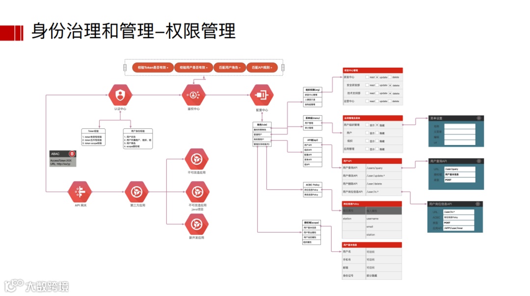 具体实践中充分考虑到授权策略的自适应、可管理及可扩展几方面的平衡,通过各种权限模型,建立满足最小权限原则的权限基线,并基于主体、客体和环境属性实现角色的动态映射,同时也可以通过风险评估和分析,对角色和权限进行过滤,实现场景和风险的动态授权。
