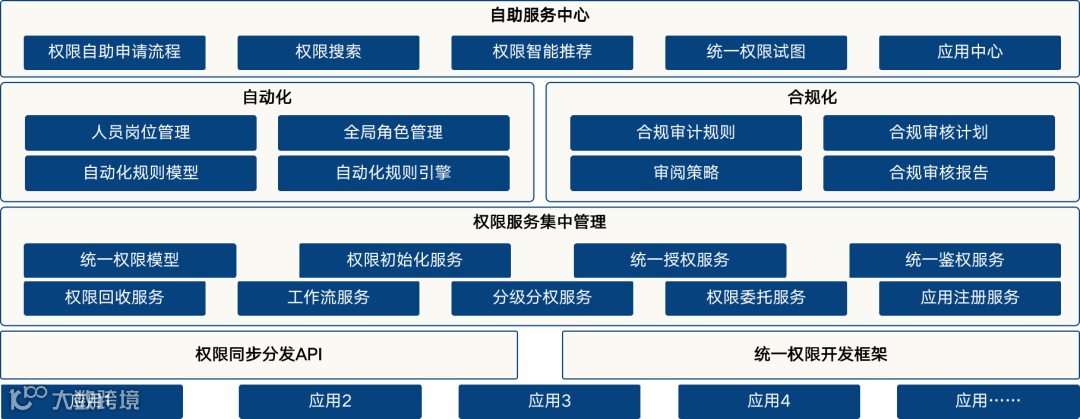 ■ 采用分层设计理念,顶层是自助服务中心,用户可在统一权限申请入口自助申请权限。提供一套完整的模型体系,能支持RBAC、ACL、ABAC、TBAC等权限模型,同时支持自定义各种模型。