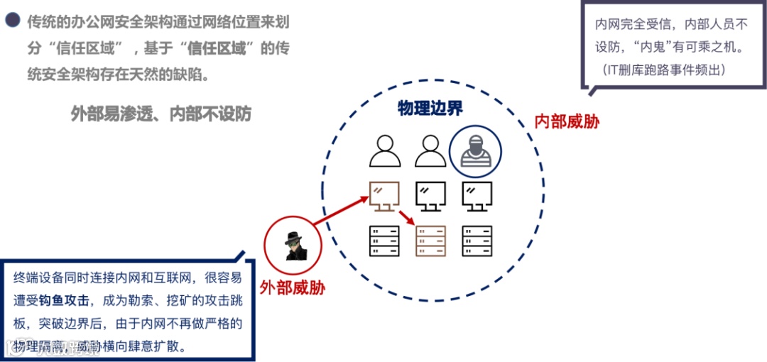 众所周知,网络安全最薄弱环节是“人”。网络攻防的本质就是人与人的对抗,人性的漏洞是网络空间治理的最大漏洞。正所谓“堡垒往往从内部瓦解”,传统的网络安全模型中处于内网可信的“人”成了威胁的来源。因此,没有绝对安全的网络,没有绝对的可信。