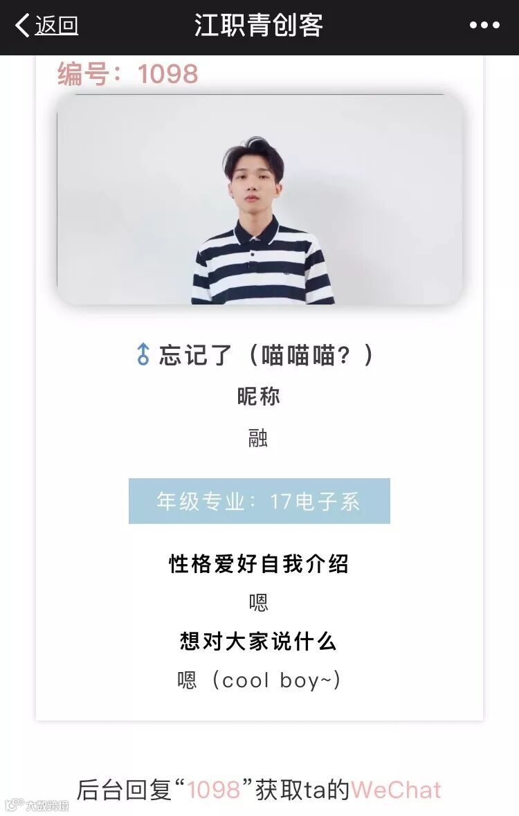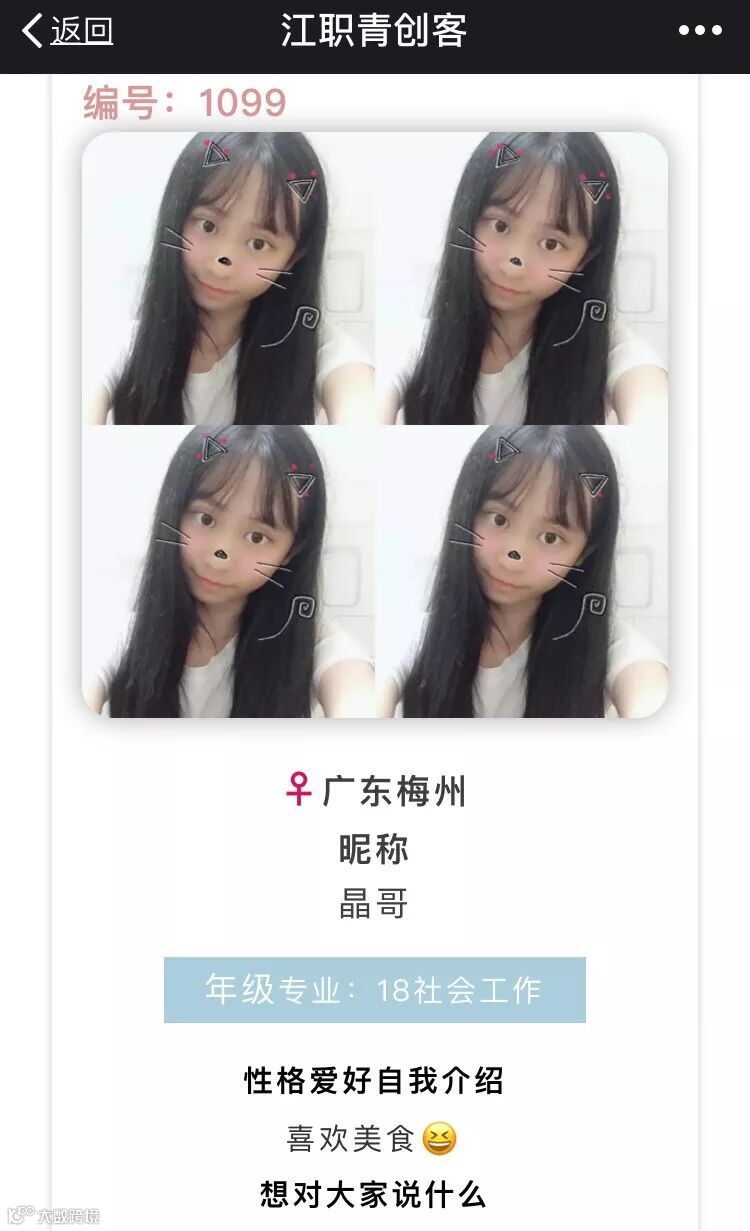 本期是新生爆照的最后一期啦~这十五期以来很感谢大家对新生爆照这个栏目的支持(mua~)18的小可爱也正式成为江职一员啦,也就是说有舍友啦~所以在此,二十要在这里隆重推出新栏目[我帮舍友找对象]只要是江职的学生都可以参加哦,我们的目的只有一个,提供平台,让你的舍友成功脱单!撒你狗粮!青创客是一个为大家服务的公众号平台,我们会推更多有趣的活动和优惠给大家,希望大家能多多关注我们,多多投稿多多参与,但是投稿还是要注意了:禁止恶搞!照片要清晰!!记得要挑舍友最好看的照片哦~
