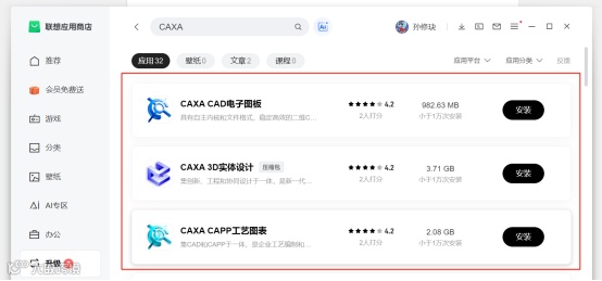 数码大方旗下CAXA CAD电子图板、CAXA 3D实体设计、CAXA CAPP工艺图表三款核心产品入驻联想应用商店,即日起,用户在联想应用商店中搜索“CAXA”,即可开启工业设计新体验,如图所示: