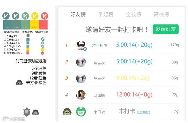 如果有一天,你睡过了,当天就会“中断打卡”。中断打卡后再次打卡,当天奖励积会重新从1克开始计算,而且还会给你加个小乌龟的图标哦!