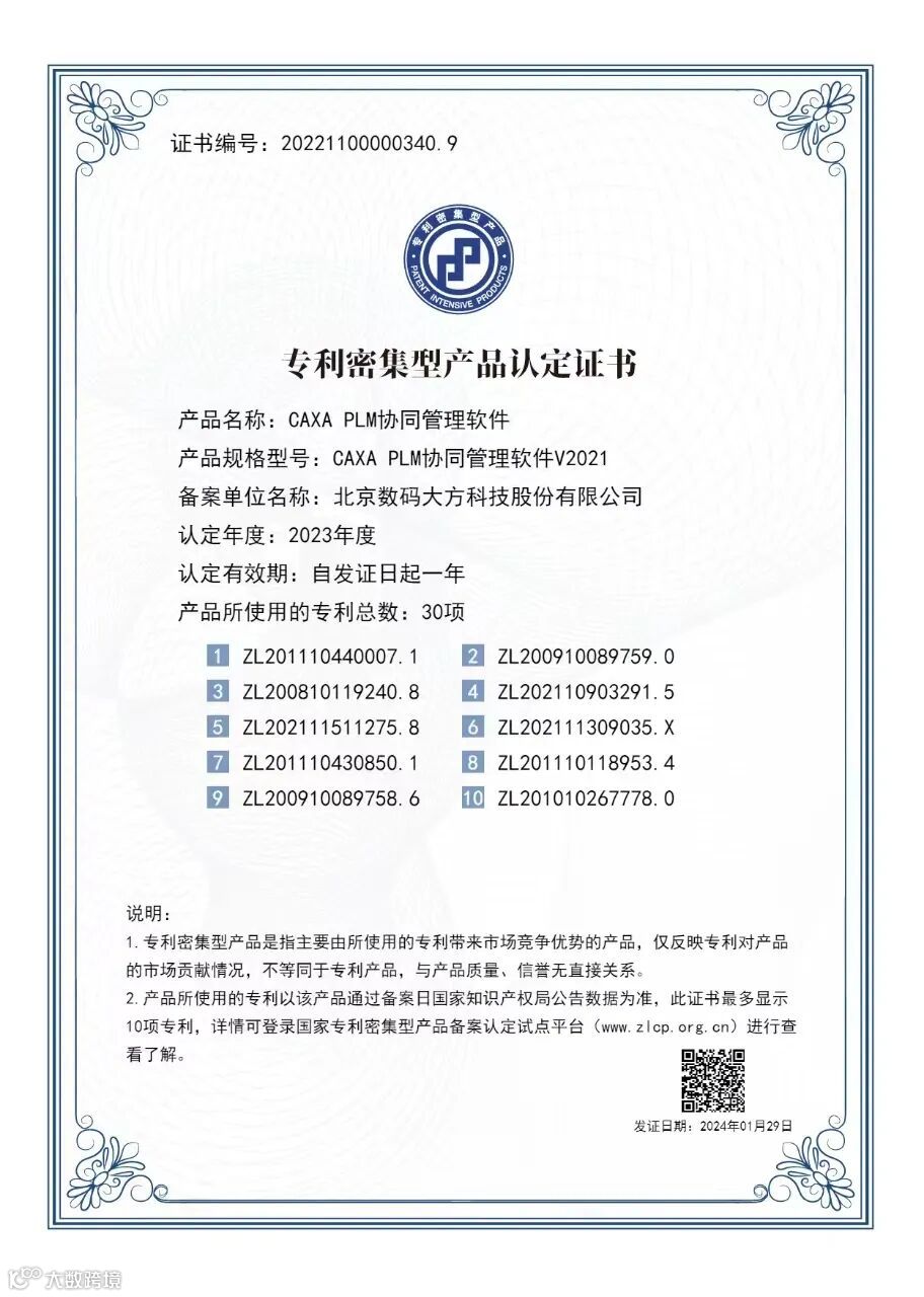 日前,国家知识产权局还公布了《2023年度专利密集型产品名单》,数码大方的三款核心产品——CAXA CAD电子图板、CAXA PLM协同管理、CAXA MES制造过程管理均被认定为国家专利密集型产品,这也是国家知识产权局首批认定的专利密集型产品。此次数码大方获得国家专利密集型产品殊荣,是对公司产品的技术先进性及市场竞争力最权威的肯定和认可。