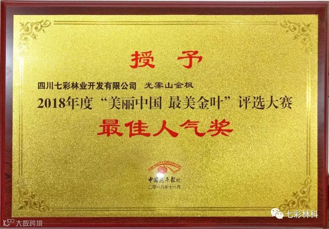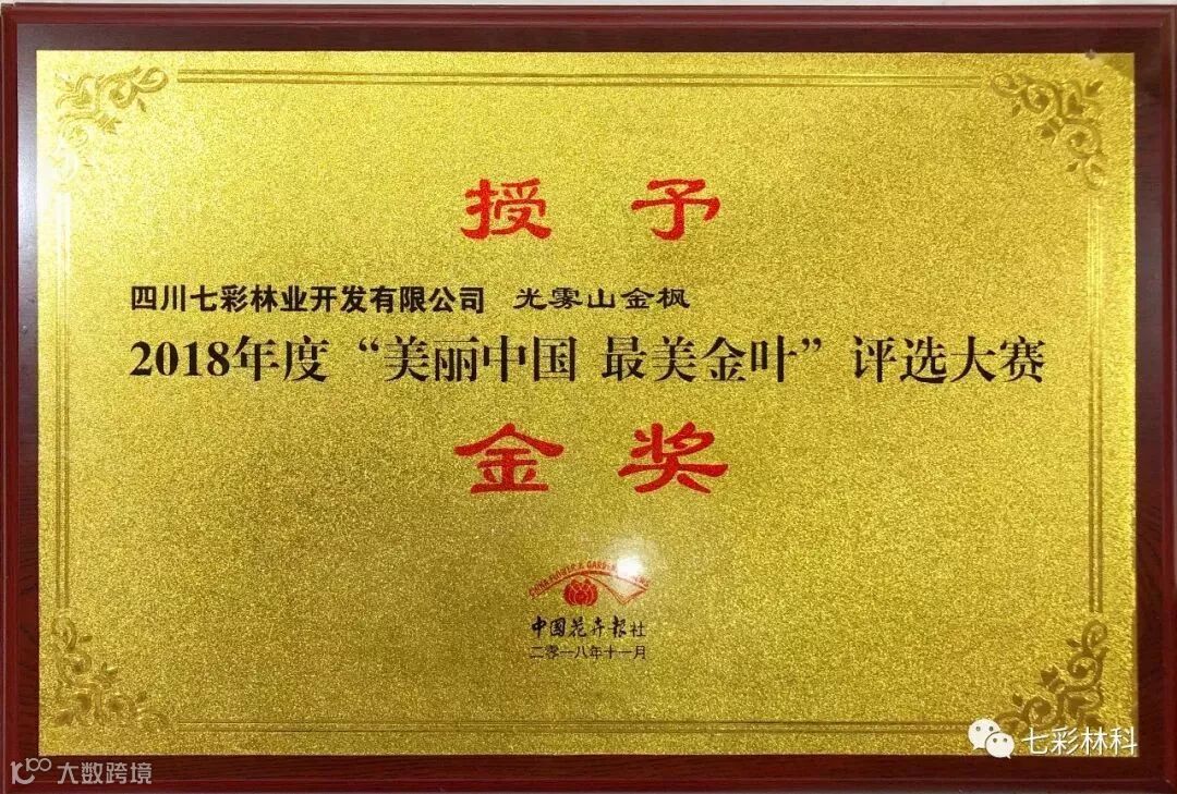2018年11月8日,“美丽中国·最美金叶”活动的评选结果,在武汉第十五届中国苗木交易会上隆重揭晓。七彩林业特色苗木产品“光雾山金枫”喜获2018“美丽中国·最美红叶”评选大赛金奖。这是七彩林业今年摘得的第三个产品金奖。此外更是从众多产品中脱颖而出,摘得最佳人气奖,深受人们的关注和喜爱。