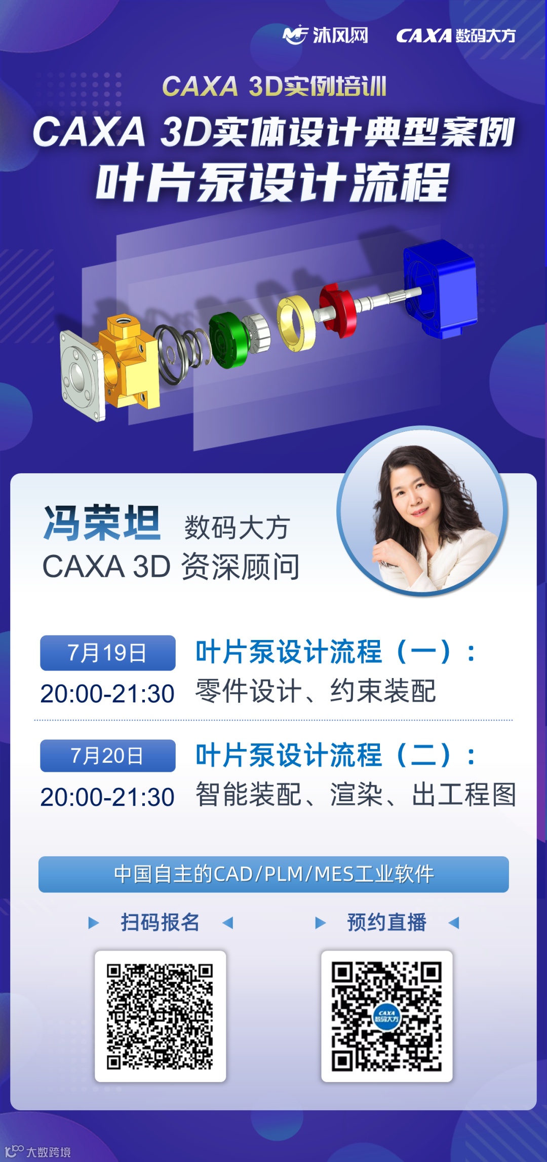 首场培训我们邀请到数码大方CAXA 3D资深顾问-冯荣坦,进行CAXA 3D实体设计典型案例-叶片泵的设计分享。7月19-20日晚20:00-21:30,我们相约直播间,不见不散!