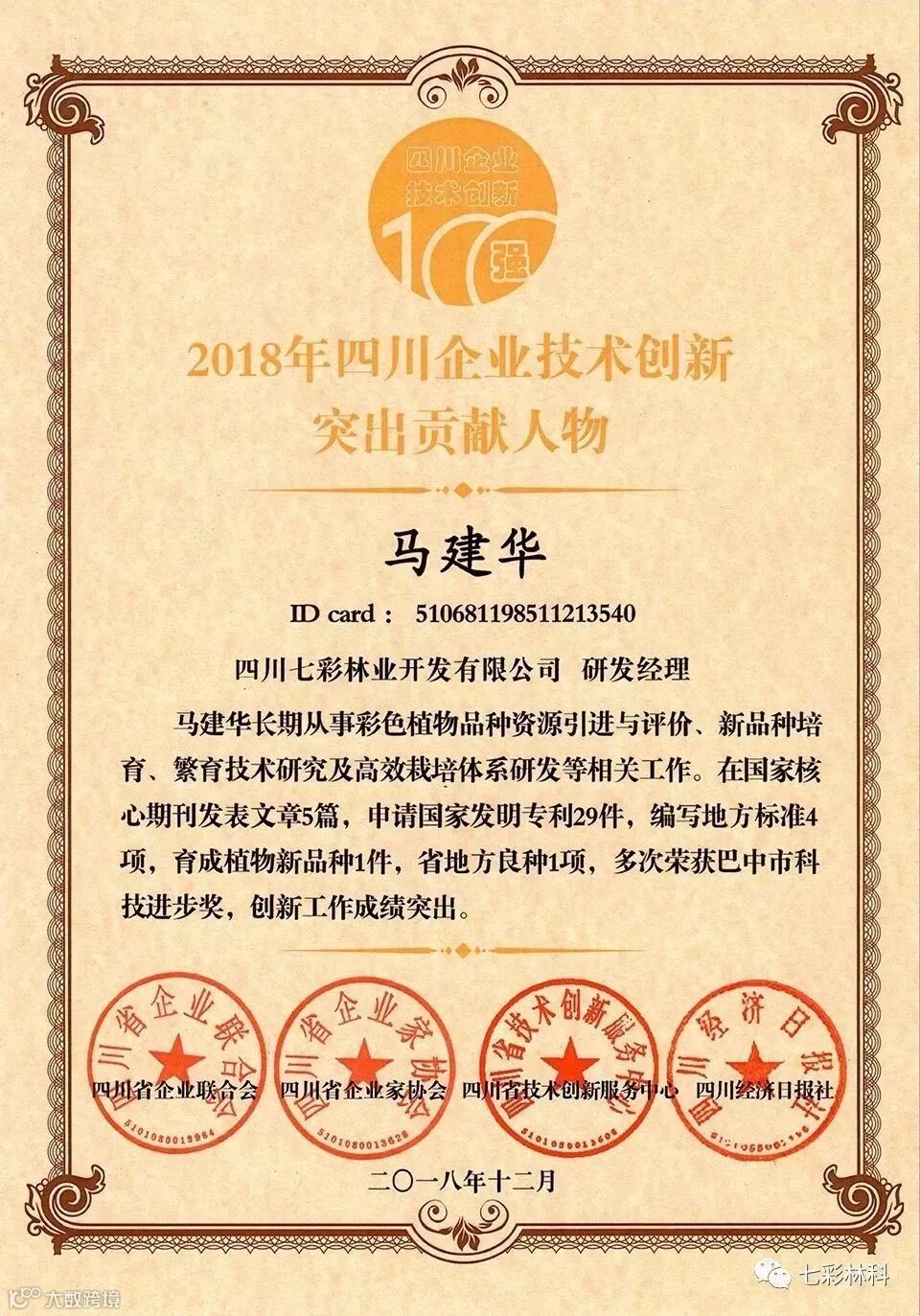 于2018年12月12日,荣获“四川企业技术创新突出贡献人物”荣誉,是七彩林科彩色植物研究院的一名优秀研发匠人。她长期从事彩色植物品种资源引进与评价、新品种培育、繁育技术研究及高效栽培体系研发等相关工作。在国家核心期刊发表文章5篇,编写地方标准4项,申请发明专利29项,多次荣获巴中市科技进步奖。