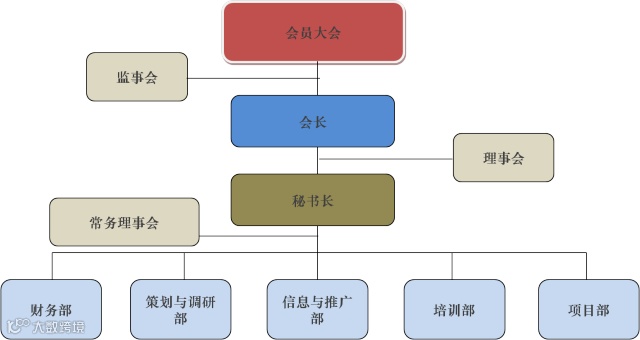 本协会组织架构清晰,内设策划与调研部、财务部、项目部、培训部和信息与推广部; 由会长单位胜泽源农业集团抽调3名员工专职协会工作,并派2名兼职财务进行协会财务管理。