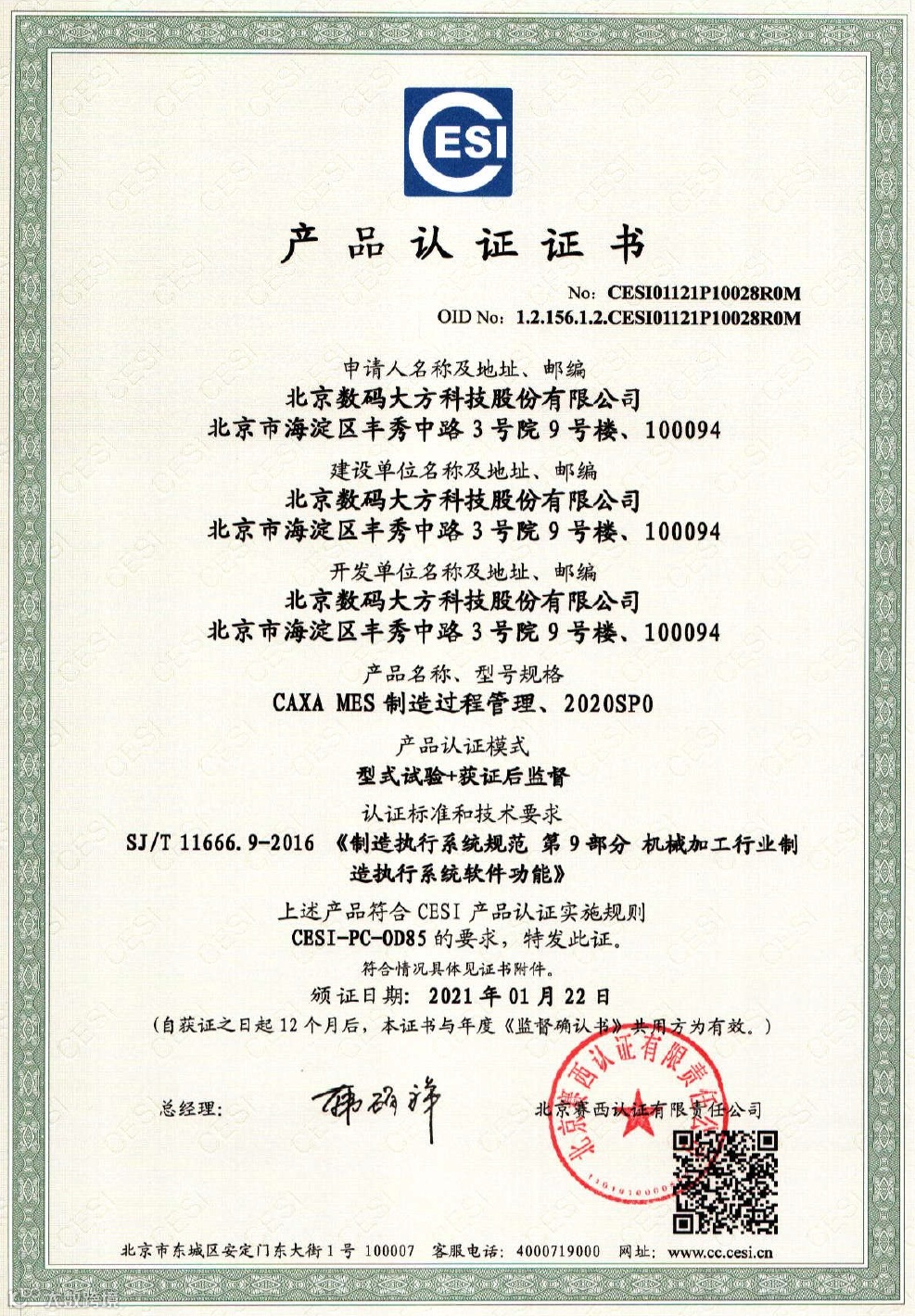 2021年1月22日,CAXA MES 制造过程管理2020(以下简称“CAXA MES”)获得了CESI产品认证证书,是国内率先通过此认证的MES系统。