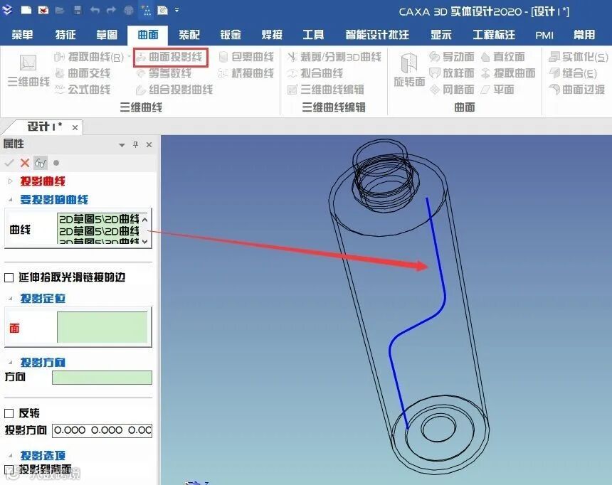 20、在曲面面板中选择【曲面投影线】,将刚画好的草图投影到圆柱体表面。