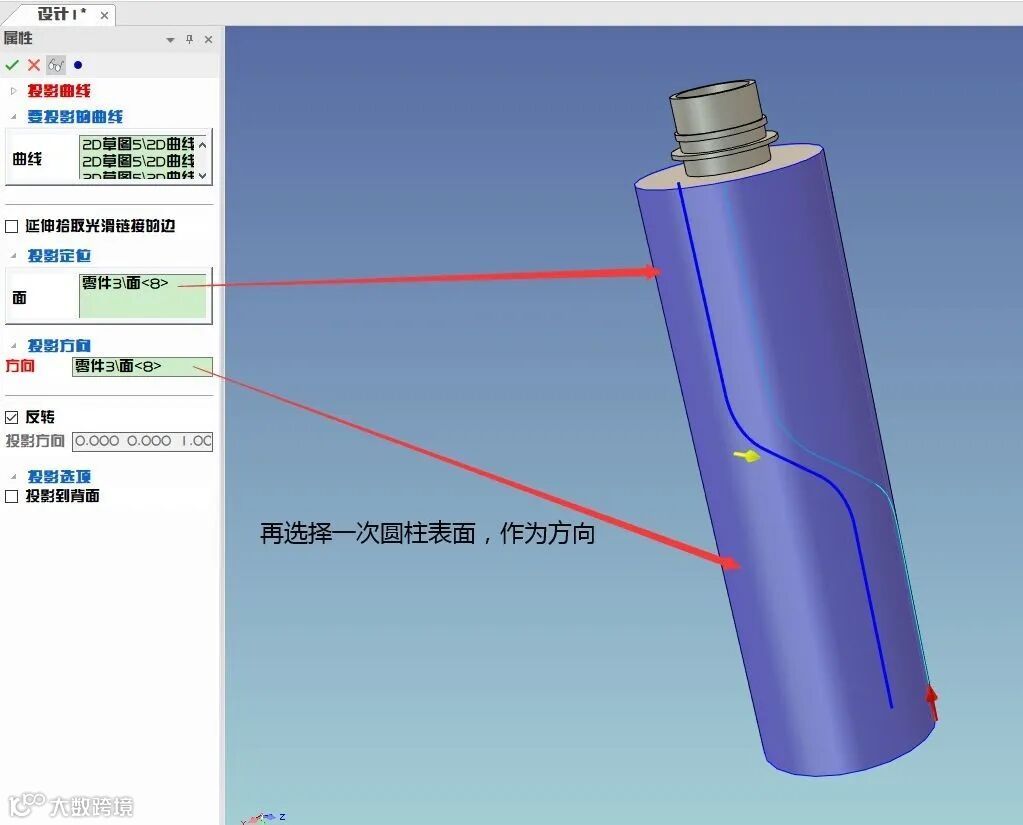24、拾取圆柱体表面,并设置投影方向。
