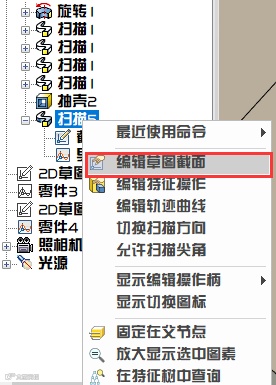 45、设计树中找到这个扫描特征,单击鼠标右键,选择【编辑草图截面】。