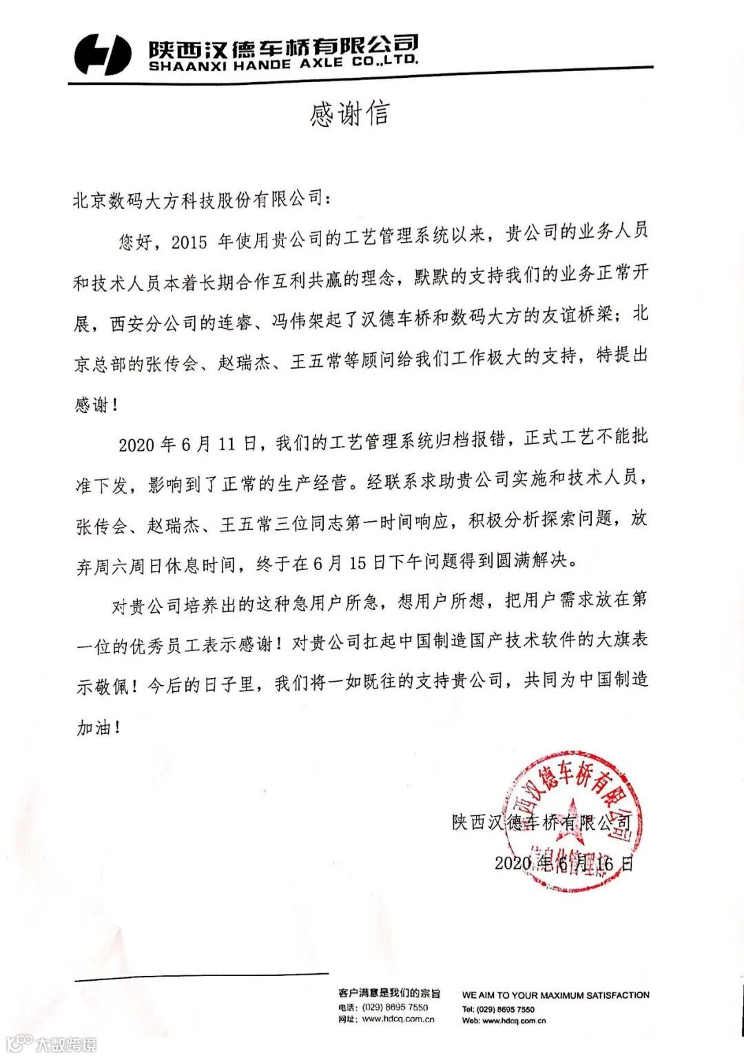 汉德车桥感谢信|CAXA高效服务获用户赞誉